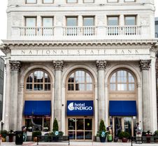At the Hotel Indigo® Newark Downtown hotel, you’ll notice a unique connection between our boutique hotel and the neighborhood. Our building was erected in 1912 and designed by Cass Gilbert as the National State Bank; we still honor these roots today with a front desk created from reclaimed teller desks and by integrating the original bank vault into our restaurant’s design. With exposed brick, beautiful windows, and unique loft configurations, our refreshing guest rooms all feature décor and artwork that reflect the neighborhood’s spirit of innovation and invention. Our restaurant is closed. We are located one block from the Prudential Center and a short walk to the New Jersey Performing Arts Center (NJPAC).